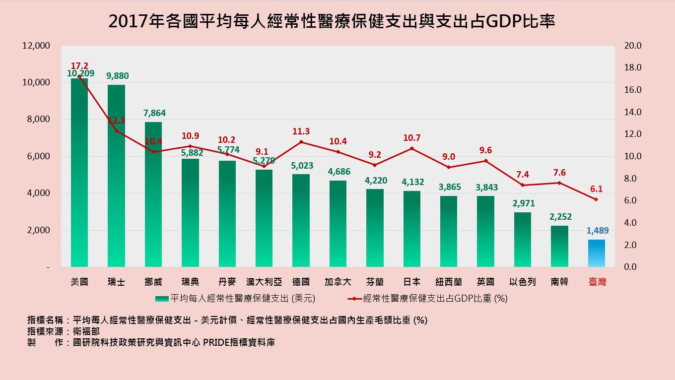 臺灣的全民健康保險傲視全球,是民眾健康安全的重要支柱與保障,而臺灣的醫療費用也低於大多數歐美先進國家。衛福部根據經濟合作與發展組織健康統計資料(OECD Health Statistics)所作的指標進行比較,2017年我國平均每人經常性醫療保健支出每年花費為1,489美元,在OECD各主要國家中偏低,不僅低於世界最高的美國(10,209美元)、瑞士(9,880美元)、挪威(7,864美元)、瑞典(5,882美元)等國,更低於鄰近的日本(4,132美元)與韓國(2,252美元)。隨著經濟成長與國民所得增加、醫療服務品質與價格相對提升,以及全民健保的被保險人數擴大,我國醫療保健支出占GDP比重從2007年的5.7%到2017年僅微幅成長達6.1%,在世界各國中算是相當低的。2017年美國為17.2%,瑞士12.3%,德國11.3%;而日本(10.7%)與韓國(7.6%)也都高於我國。(上線日期:2019-11-29)