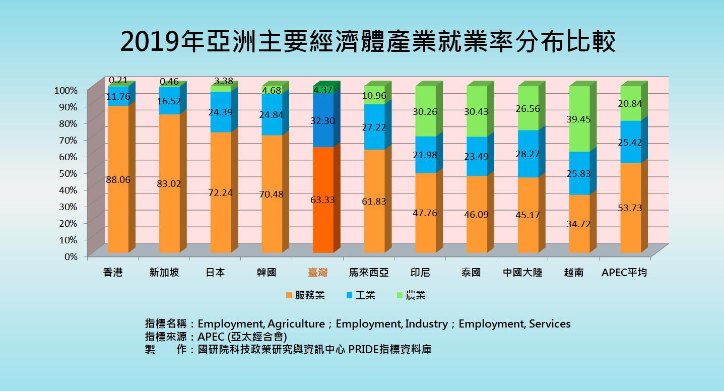 根據亞太經合會(Asia-Pacific Economic Cooperation, APEC)針對各會員經濟體產業的就業率調查,2019年服務業平均為53.73%,而以香港的88.06%為最高,其次是新加坡(83.02%)。工業平均為25.42%,而以臺灣的32.3%為最高,其次是中國大陸(28.27%)。農業平均為20.84%,越南39.45%是鄰近國家中最高的,新加坡(0.46%)與香港(0.21%)均不到1%。產業就業率的高低反映其在國家經濟發展上的人力需求。