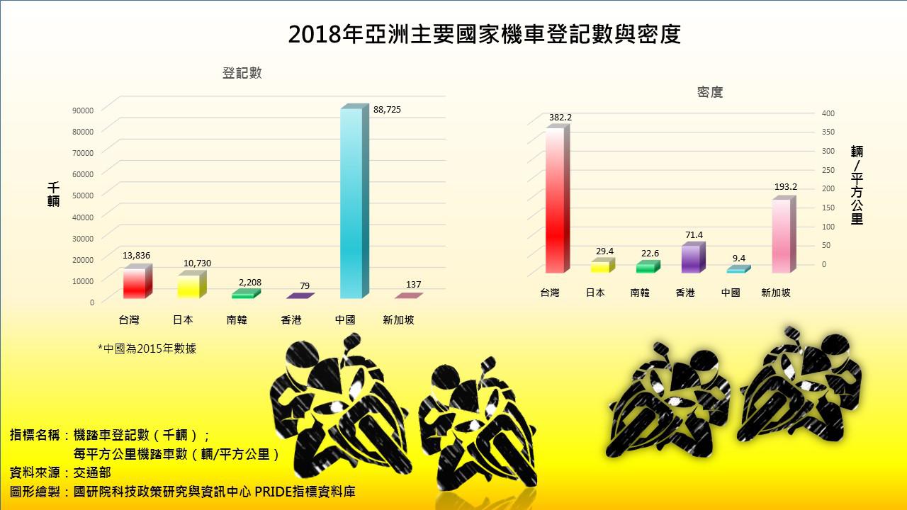 機車是台灣各城市的主要交通運具之一,從上圖亞洲主要國家機車登記數中,我國2018年機車登記數為1,383萬6,000輛,若以2018年我國總人口數2,358萬9,000人來計算,平均1.7人就有一台機車;若又以每平方公里機車數來看,我國的機車密度為382.2輛/平方公里,也在比較國家中居冠,難怪在馬路上你會覺得機車比一般四輪車子還多,走到哪裡都會看到它呼嘯而過。我國地狹人稠、人口集中,加上氣候溫暖、冬天不下雪、路面不結冰,適合機車之行駛,加上機車之機動性與自主性強,不必局限於大眾交通工具之班次與時間,這也是形成我國機車普及率及密度都高的主要原因之一。