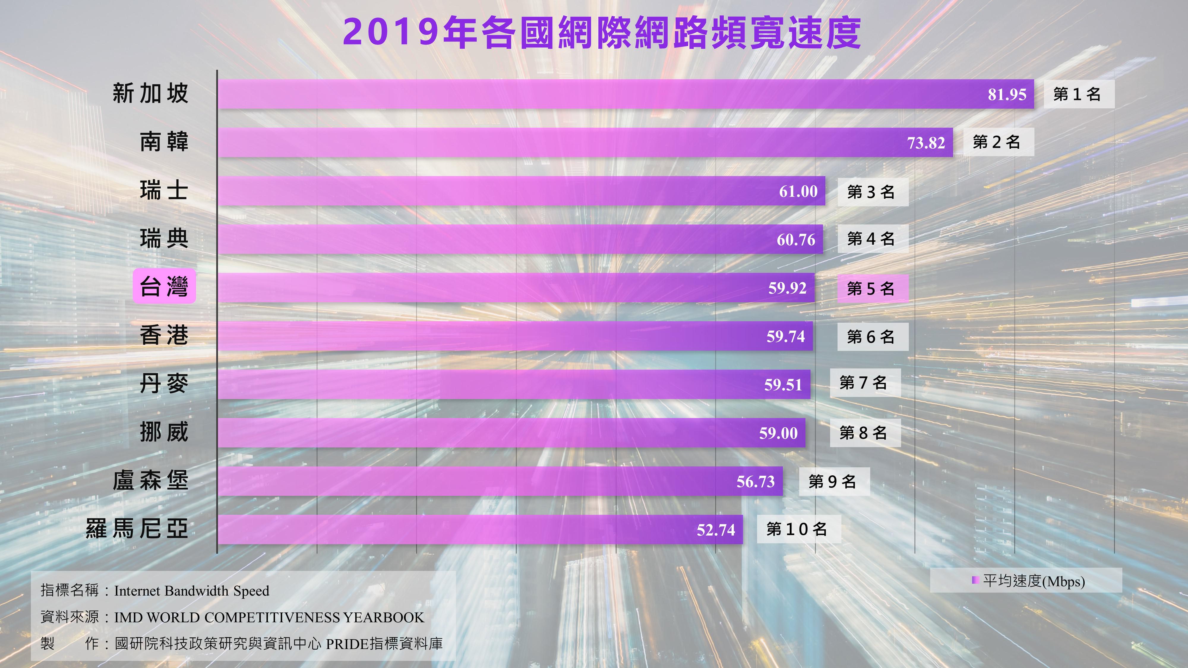 根據2020年「IMD世界競爭力年報」針對全球63個主要經濟體所作的「各國網際網路頻寬速度」排名,亞洲經濟強國新加坡拿下第1名,平均速度來到81.95Mbps。第2名是韓國(73.82Mbps)、第3名及第4名則分別是瑞士和瑞典。第5名由台灣所榮獲,相較2018年上升13名,表現不俗,領先許多技術先進大國,包括美國(第12名)、法國(第15名)、德國(第26名)、英國(第35名)。除此之外,在亞太地區以第3名的姿態領先香港(第6名)、日本(第19名)、中國大陸(第25名)等科技強國。