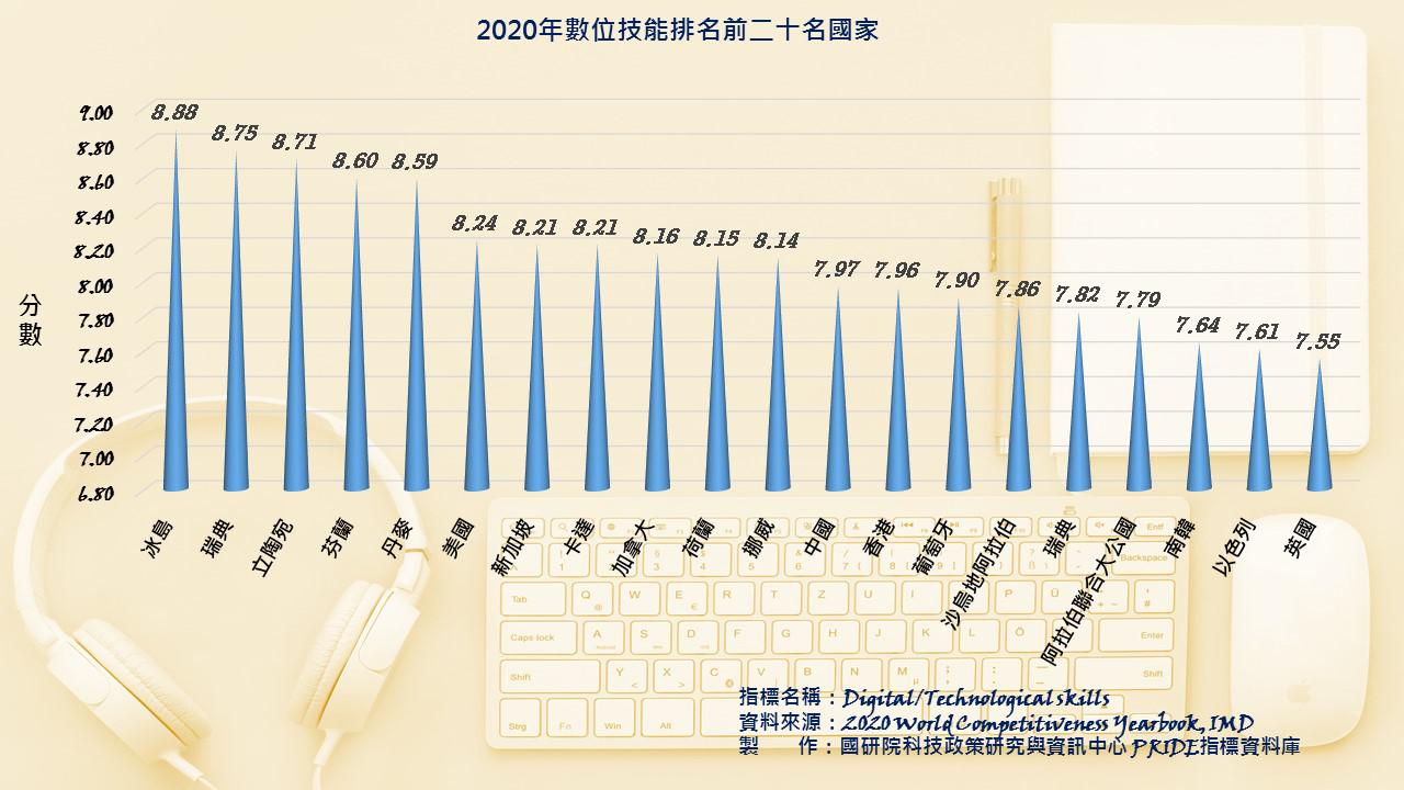 台灣排名第二十五名,評比7.41分。台灣鄰近國家中有四個國家的數位技能表現領先台灣,依序為新加坡(第七名,8.21分),中國(第十二名,7.97分)、香港(第十三名,7.96分)、南韓(第十八名,7.64分)。台灣近五年來數位技能的表現從2016年的7.66分、2017年的7.22分、2018年的6.74分、2019年的7.15分,截至目前2020年的7.41分,仍有進步的空間。行政院推動「數位國家‧創新經濟發展方案(DIGI+)」的七大主軸之一為「培育跨域數位人才行動計畫」,強化人才的跨域數位技能,為國家產業數位經濟化轉型所需之人才做準備。