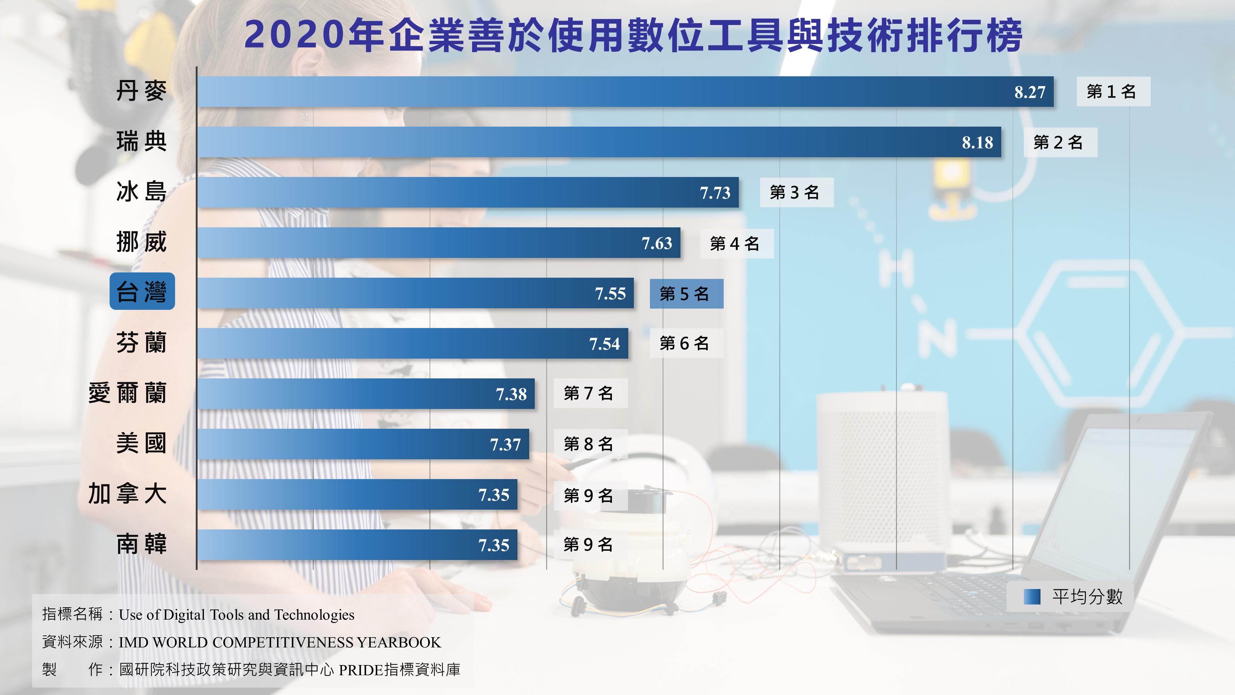 根據2020年「IMD世界競爭力年報」針對全球63個主要經濟體所作的「各國企業善於使用數位工具與技術」排名,歐洲童話王國丹麥拿下第1名,平均分數為8.27分。緊接下來第2名則是瑞典(8.18分)、第3名及第4名則分別是冰島和挪威,前4名皆是北歐國家。第5名是由台灣所榮獲,相較2019年排名上升了4名,表現相當亮眼,在亞太地區以第1名的姿態領先各國,包括韓國(第9名)、中國大陸(第15名)、香港(第16名)、新加坡(第18名)。值得一提的是,世界科技強國的排名包括美國(第8名)、加拿大(第9名)、以色列(第12名)、英國(第19名)、德國(第53名)皆落後於台灣,可見台灣科技實力不容小覷。古老的維京王國丹麥,現已逐漸轉型成高科技與綠能王國,丹麥在2019年人均GDP全球排名第9,經濟發展相當迅速,加上完善的教育與市場機制,企業更能運用數位工具永續運營下去。