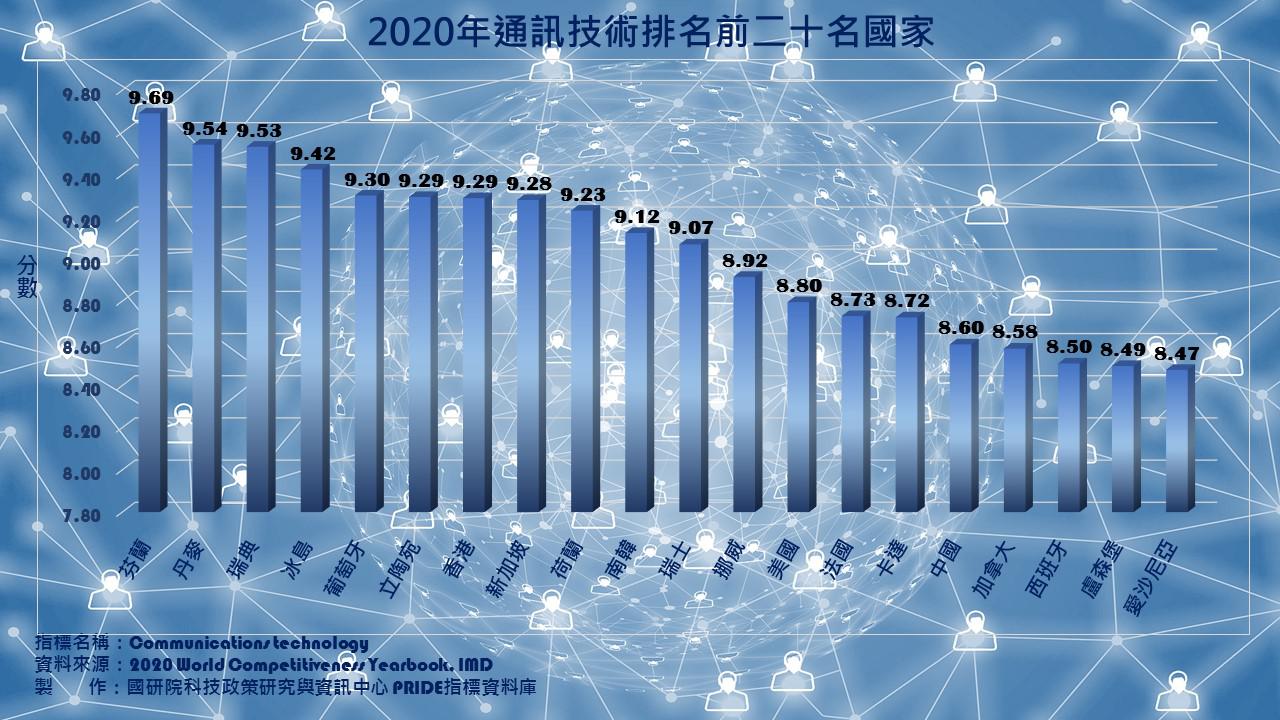 瑞士洛桑管理學院(IMD)調查了2020年63個經濟體之通訊技術整體表現,分數越高表示該國通訊技術表現越佳。前二十個國家排名如上圖,排名中以歐洲國家佔了13名、亞洲國家佔了5名、美洲國家佔了2名。