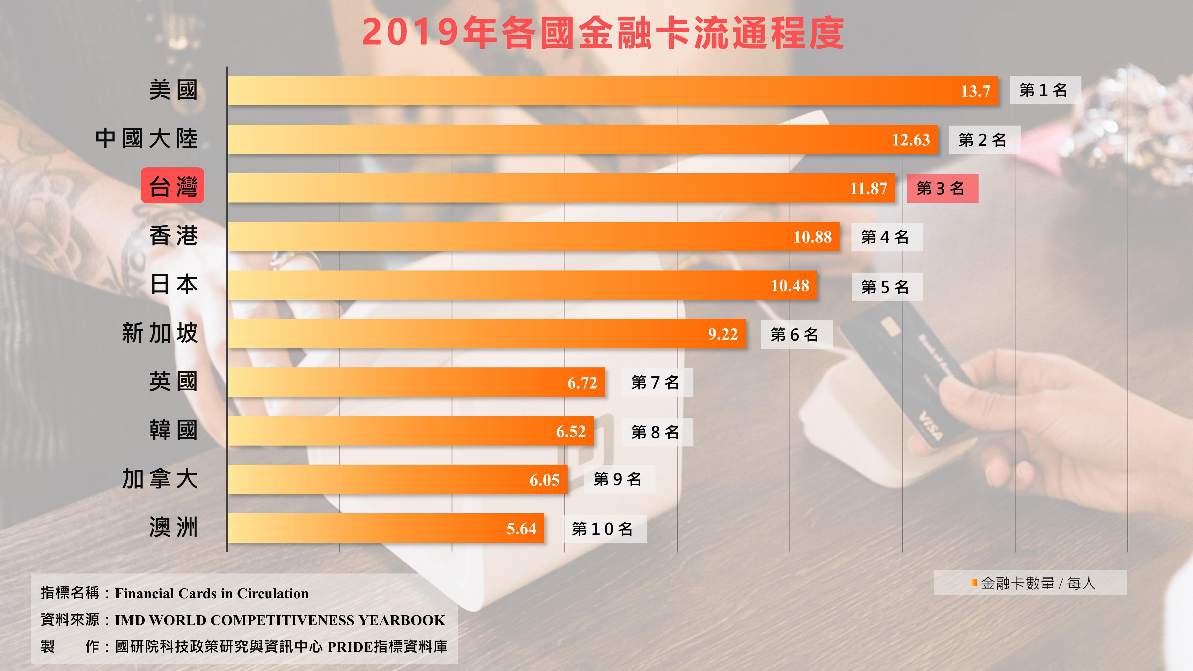 根據2020年「IMD世界競爭力年報」針對全球63個主要經濟體所作的「金融卡流通程度」排名,著名金融公司Visa及萬事達卡發源地美國拿下第1名,人均金融卡數為13.7張;第2名則是由中國大陸所拿下,人均金融卡數為12.63張。台灣在該榜單中排名第3(人均11.87張),在亞太地區中名列前茅,包括香港(第4名)、日本(第5名)、新加坡(第6名)、韓國(第8名)、馬來西亞(第24名),可見台灣在金融卡的普及度是相當高的。另一方面,該排名中的第7、第9與第10名則分別是由英國、加拿大及澳洲所獲得。