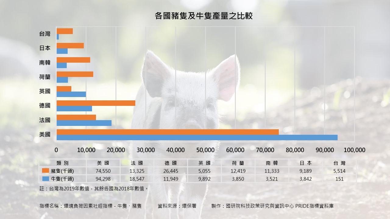 美國雖然是畜牧產業大國,但根據美國農業部資料表示,中國才是畜牧生產量世界第一的國家,世界豬和牛生產國前三名是中國、巴西和美國,其中美國豬牛產量分別高達74,550千頭及94,298千頭,亦有足夠的量可向世界出口肉類,歐洲生產豬和牛主要國家是德國、法國、英國,其中德國在歐洲產量最高,豬有26,445千頭、牛有11,949千頭,在亞洲國家如日本和韓國以生產豬為主,分別有9,189千頭及11,333千頭,而台灣豬產量有5,514千頭及牛151千頭,因牛肉產量少,所以需要進口牛肉,以滿足消費需求,與其他國家比較起來,台灣肉品產業規模非常小。