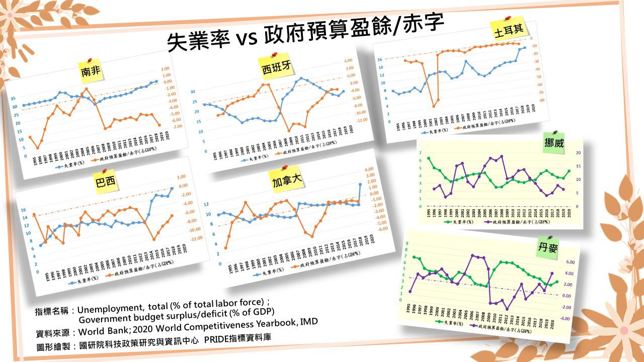 上圖為1995年以來處於高失業率之國家,有南非、西班牙、土耳其、巴西、加拿大,2020年這五個國家之失業率分別為28.74%、15.67%、13.92%、13.67%、9.48%。上圖嘗試將其歷年失業率與政府預算盈餘/赤字作趨勢比較,如圖所示,失業率的升高,政府預算通常呈現赤字,這些高失業率國家,其政府財政大半都長期處於赤字狀態。挪威、丹麥是歐洲國家中失業率較低的國家,其政府預算則大部分處於盈餘狀態。在當今時代,很少有國家能實現預算盈餘,因為大部分國家選擇在預算赤字的同時採取擴張性財政政策,如透過增加政府開支推動各項公共建設以帶動民間投資,達到活絡經濟的目的。雖然政府預算盈餘不一定是好的或是壞的,但是長期的盈餘或是長期的赤字將引起嚴重的社經問題。