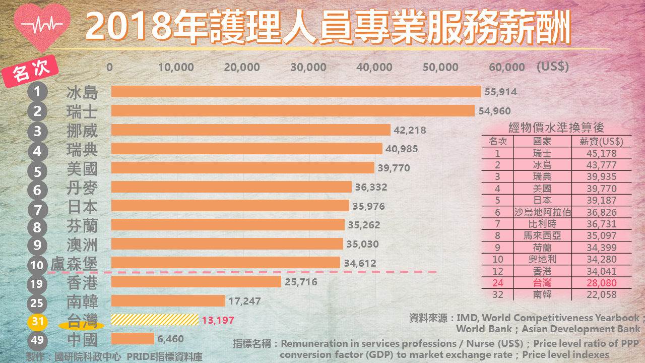 依據瑞士洛桑管理學院(IMD)發布的「世界競爭力年報」中的數據顯示,2018年護理人員專業服務薪酬(年薪)以冰島(US$55,914.37)及瑞士(US$54,959.7)的待遇最為優渥,與第三名的挪威(US$42,217.57)存在一萬美元以上的明顯落差,而在前十名的國家中,北歐五國便占了五個名額,日本則是唯一躋身前十名的亞洲國家,香港以第19名緊追在後,而南韓與台灣的護理人員薪酬竟不到前十名國家的一半,中國甚至與排名第一的冰島有8.6倍的差距。但若進一步探究各國物價水準與薪酬的關係,將薪酬經過購買力平價轉換因子的換算後,不難發現專業服務薪酬中榜上有名的國家也大多是物價水準較高的國家,我國的名次自第31名提升至第24名,略贏南韓的第32名;反觀馬來西亞原始排名為第32名,但經過購買力平價的換算後,躍升至第8名,顯示我國在護理人員的薪資待遇上仍有相當大的進步空間。