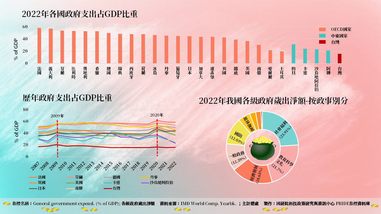 政府為了人民的福祉,提供公共服務,並將公共政策轉化為可執行的預算,因此,政府的支出是反映政府施政方向的重要參據。而政府支出的規模通常會以一般政府支出占國內生產毛額(GDP)的占比來衡量,也就是各級政府歲出淨額占國內生產毛額之比率。